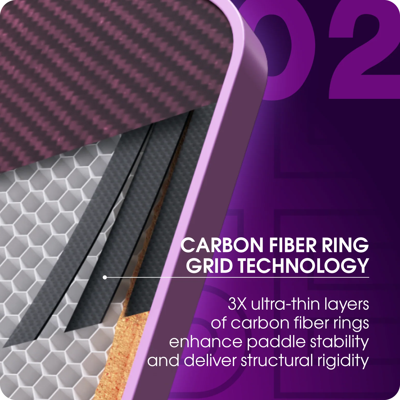 3 couches ultra-fines d’anneaux en fibre de carbone améliorent la stabilité de la raquette.